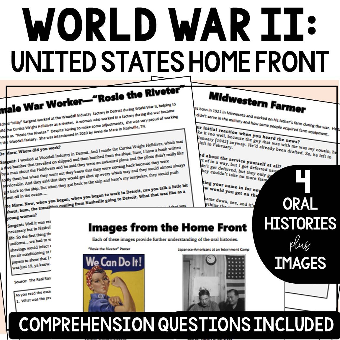 Students will enjoy learning about the different experiences on the home front during World War II by reading oral histories from a female factory worker, a Japanese-American at an internment camp, a member of the Woman Army Corps and a farmer. Four images complement the oral histories to further student understanding. This can work as a Reader's Theater exercise with small groups, as independent reading or as a homework assignment.
